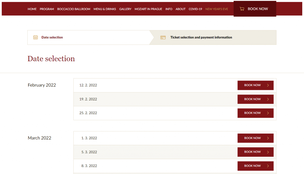 E-shop jako takový nemá žádný výpis produktů, nebo detail produktu. Objednávkový proces se skládá z výpisů produkt na stránce Date selection, kde jsou produkty vypsány dle data konání eventu.